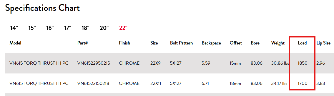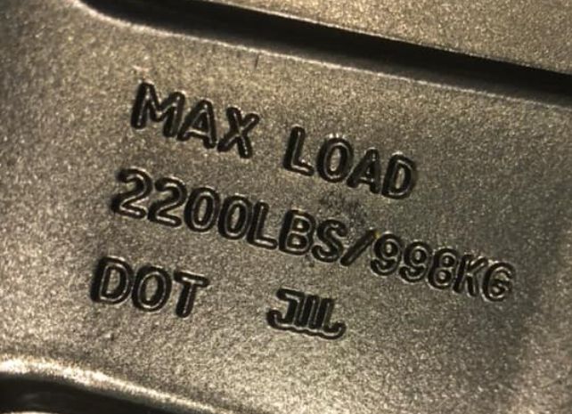 You can also find a wheel's load rating on our website by looking at the specifications chart at the bottom of the product page If you already have a wheel, simply look at the stamp on the back of the wheel indicated as "Max Load"